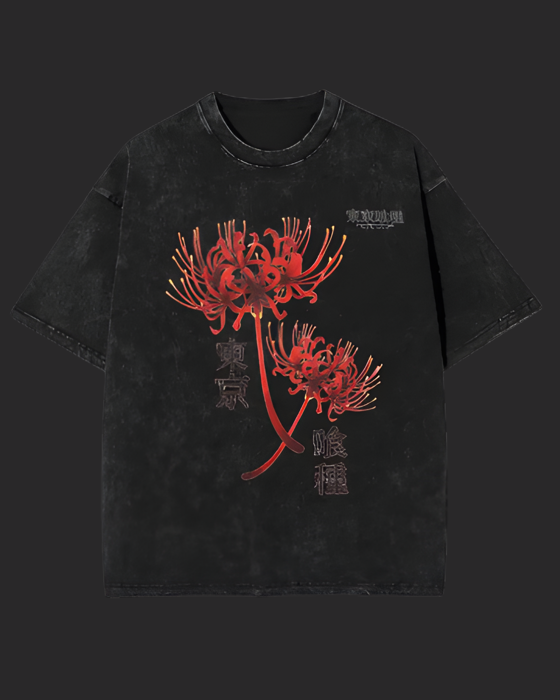 The red spider lily blooms where death and rebirth meet. For Kaneki, it marks loss, hunger, and the thin line between human and ghoul. This Vintage Acid Wash Tee captures that quiet tragedy—beautiful, painful, and unforgettable.